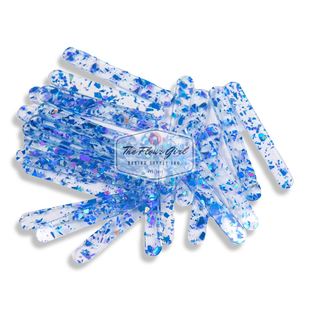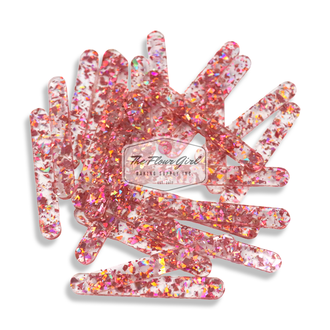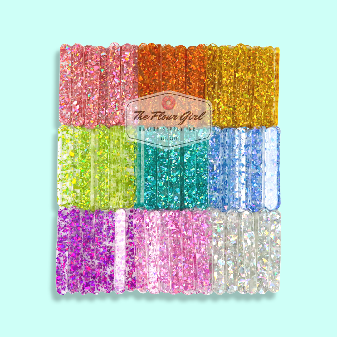 Cakesicles don't have to be boring! Add a pop of colour and jazz up your cakesicles, ice cream popsicles, cookie dough pops and more with food-safe glittery acrylic popsicle sticks. Sticks are compatible with each cakesicle mold sold in our shop. Each colour option comes with 24 or 48 popsicle sticks.