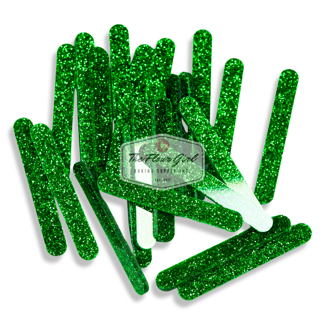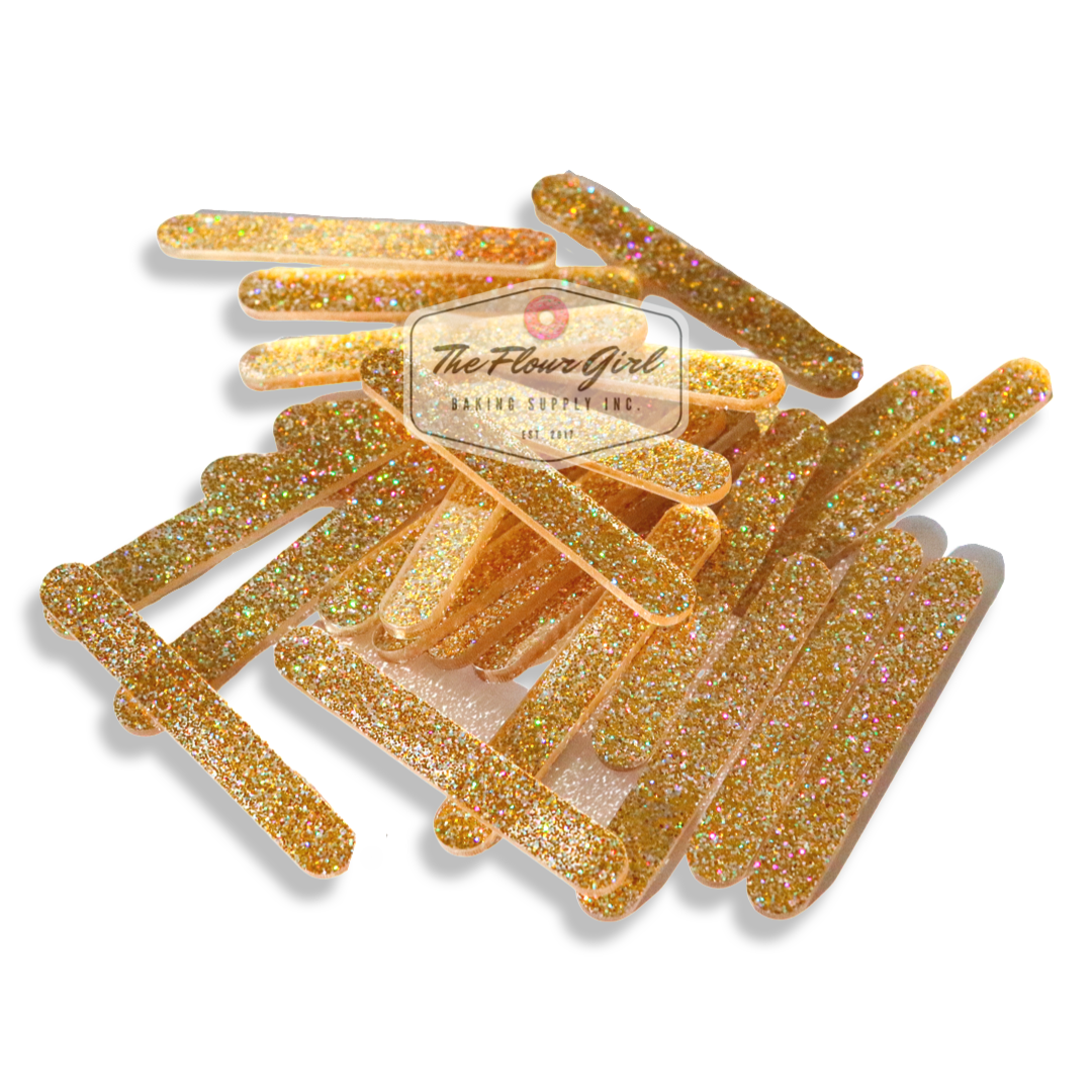 Cakesicles don't have to be boring! Add a pop of colour and jazz up your cakesicles, ice cream popsicles, cookie dough pops and more with food-safe glittery acrylic popsicle sticks. Sticks are compatible with each cakesicle mold sold in our shop. Each colour option comes with 24 or 48 popsicle sticks.