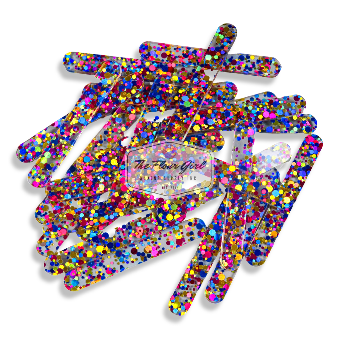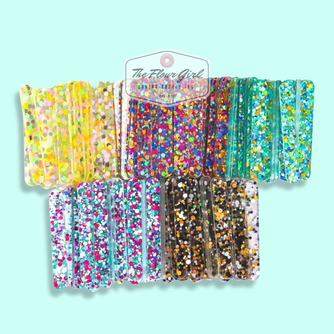 Cakesicles don't have to be boring! Add a pop of colour and jazz up your cakesicles, ice cream popsicles, cookie dough pops and more with food-safe glittery acrylic popsicle sticks. Sticks are compatible with each cakesicle mold sold in our shop. Each colour option comes with 24 or 48 popsicle sticks.