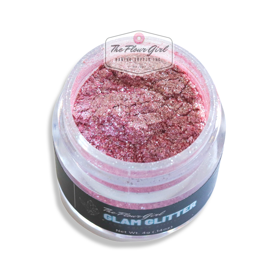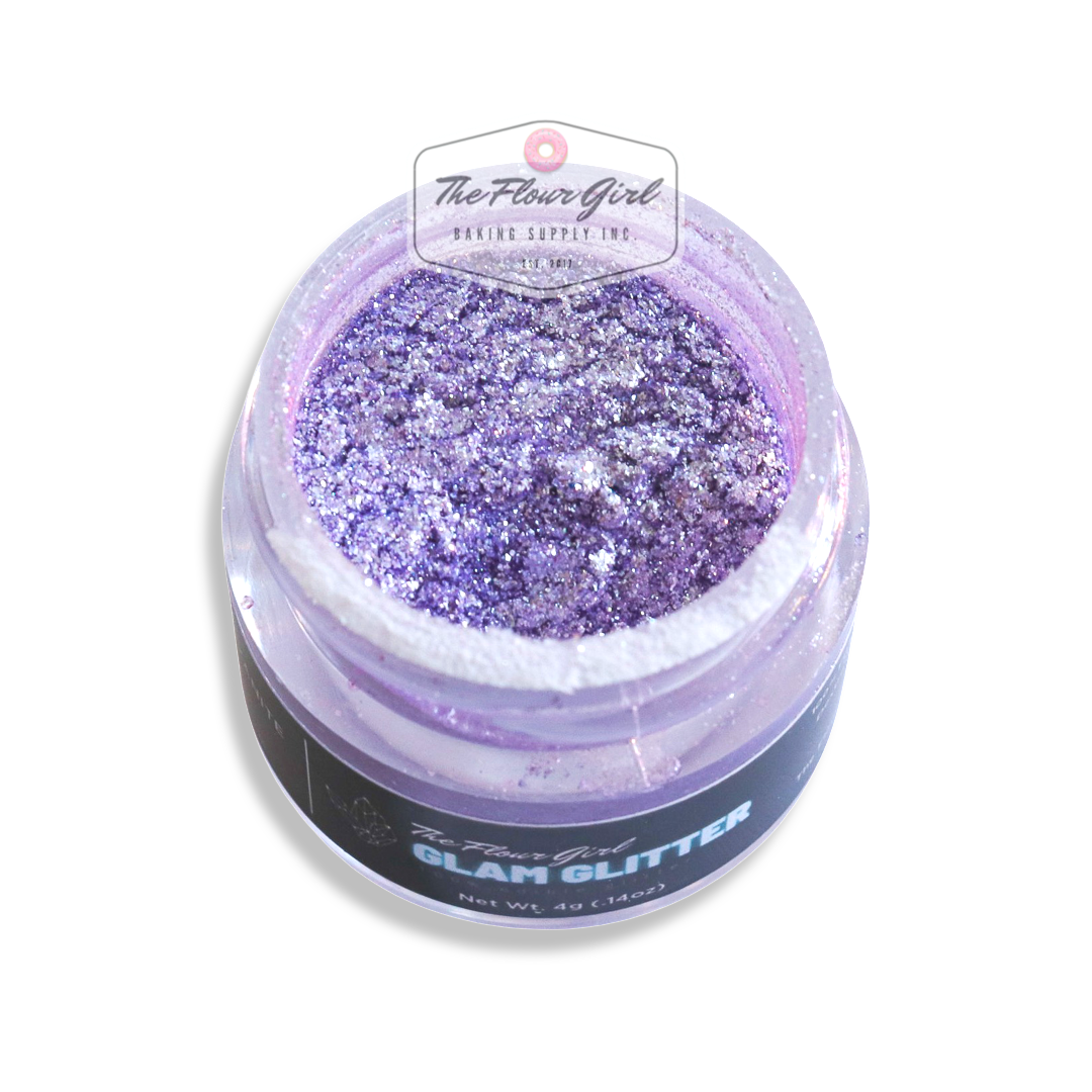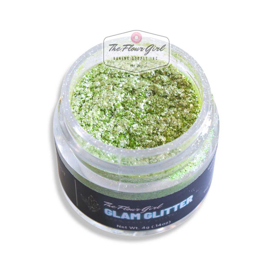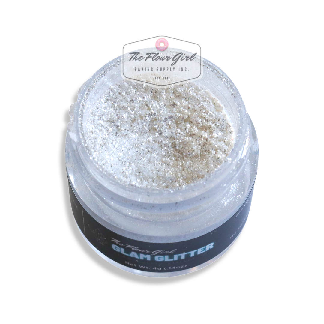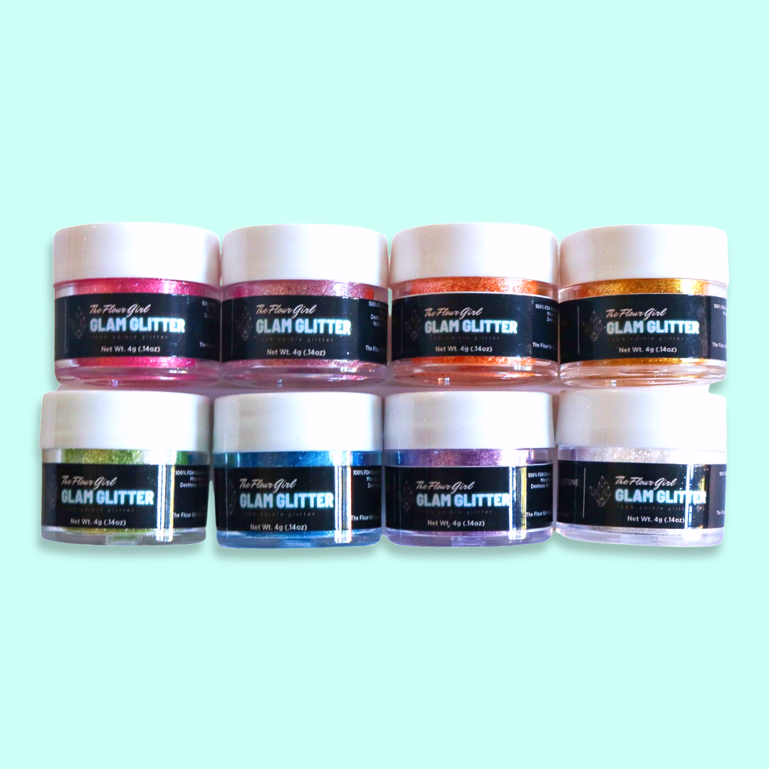 Presenting brand new 100% edible TFG Glam Glitter! Each 4oz jar contains edible glitter that can be applied to cakes, cupcakes, cakesicles, cookies, donuts, pastries, and even clear liquids to add some GLAM! To use, dip the end of a fluffy brush into the glitter, hold it over your dessert, and tap it on top. Or, you can choose to brush it on directly for a more subtle shimmery look!