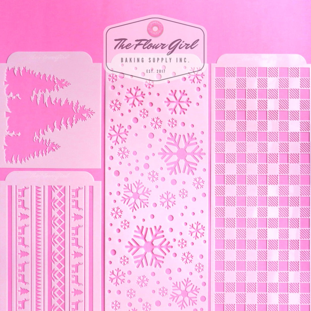 Our 3 pack of cake stencils are made to wrap a 6" diameter layered cake. No more needing to stop and move the stencil around the cake to help create a seamless pattern! Stencils can also be used over fondant or other smooth surfaces. Each one is made with food safe PET material.